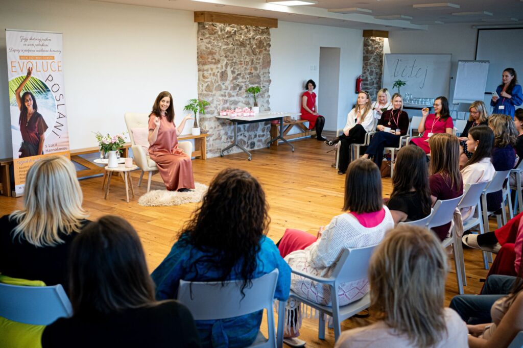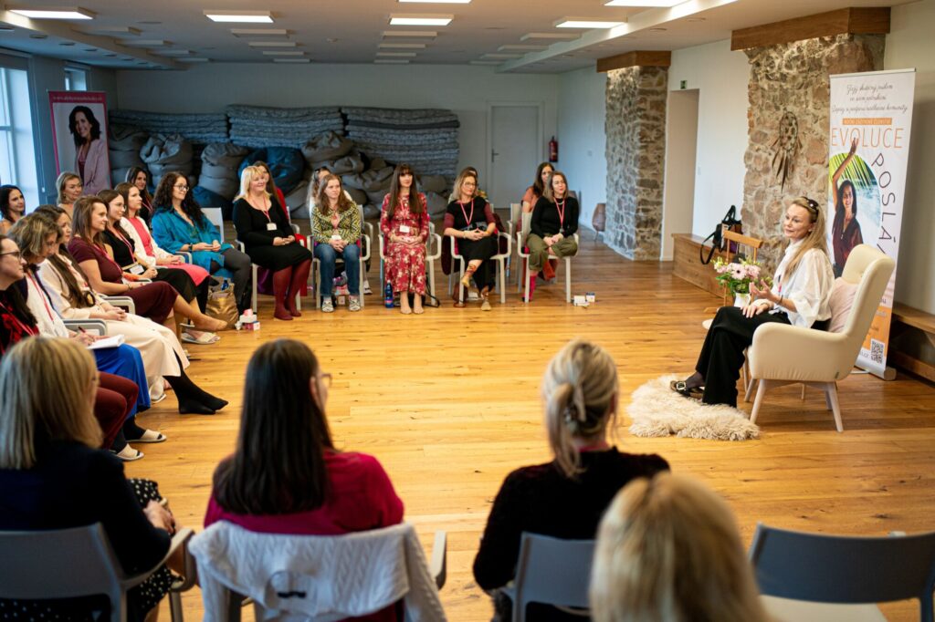 Promlouvá opět Lucka. Mluví o pocitech, které mohou přicházet těm ženám z Evoluce poslání, které ještě nemají rozjeté podnikání, nebo podnikají jinak než ostatní. „Je spousta žen, které sem nejely, protože si myslely, že to není pro ně. Kdykoliv to spouští proces, zkuste si s tím jenom tak být. Patříme, kamkoliv chceme.“