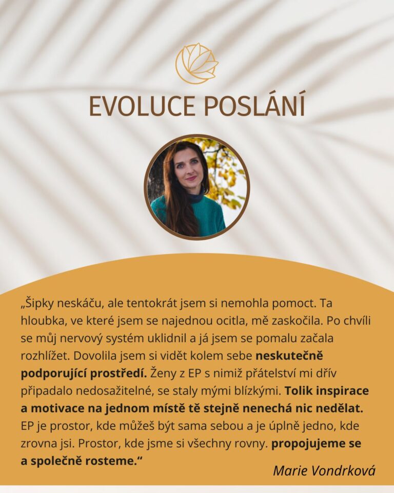 ,,Je to teprve krátce, co jsem vstoupila do Evoluce Poslání. Měla jsem s tím velké procesy, protože to pro mne byla velká investice. Evoluce Poslání je neuvěřitelné pole skvělých žen, kde je možné všechno. To je to nejvíc. Informace a Lucky vedení, které nás nasměrovává, vše plyne a proudí. Mám pocit, že ať si stanovím jakékoli vize, záměry a cíle, jsou možné. V EP sdílíme vše, to když se daří, i to když se nedaří. A to je pro mne důležité a opravdové. Těším se, co mi přinese následující rok.”