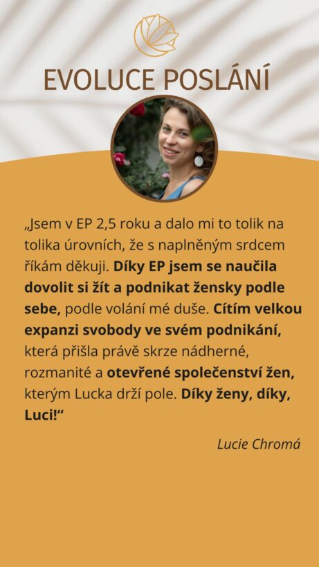 ,,Když jsem vstupovala do Evoluce Poslání věděla jsem, že se potřebuji otevřít vzájemné podpoře a síle ženského propojení. Věděla jsem, že už na to nechci být sama. Evoluce Poslání mě překvapila nejen propojováním, ale také velmi kvalitním obsahem kurzů, masterclass a intenzivní podporou Lucky. Úžasnými živými akcemi, ze kterých vždy odjíždím silnější a jistější sama sebou. V takovém prostředí se nejenom krásně tvoří, ale také se mnohem lépe překonávají nesnáze a výzvy v podnikání i v osobním životě.“