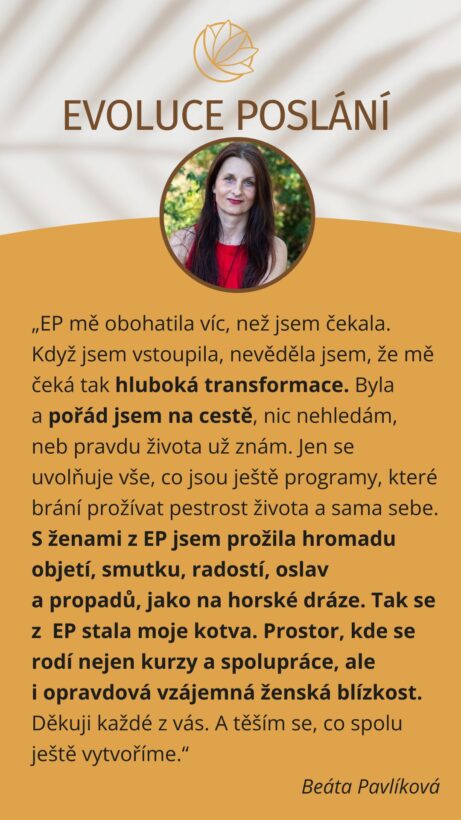 ,,EP je podnikatelsky ten nejbožejší prostor. Je tam všechno, co potřebuješ! Kurzy, masterclass, strategie, data, fakta, ale i podpora, emoce a sounáležitost. Hlavně nikdy nejsi na nic sama, jsi v poli úspěšných žen a máš zde možnost i propagace. Tohle je prostě seberozvoj obřích rozměrů! Jsem v EP od března a od té doby jsem si hluboce hrábla do svých témat a vůbec netušila, že to v takové intenzitě zvládmu. Odvažuji se říct nahlas to, co bych se dříve bála pošeptat jen sama sobě. Tvůj posun a posun tvého podnikání nejdou oddělit, to je Evoluce.”