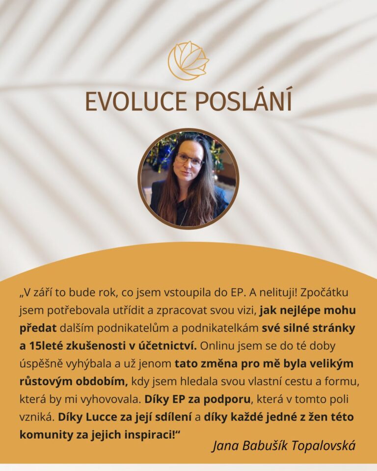 ,,Evoluce Poslání je pro mě prostor pro osobní i podnikatelský růst. Jsem v něm již 10 měsíců a je to jízda! Masterclass a mentoringy na zajímavá témata, setkání, akce, vzájemná inspirace, spolupráce, plná přítomnost Lucky a jí držené pole hojnosti a růstu. V Evoluci se stále něco děje, a je to neskutečně nakopávací. Spojení s úžasnými ženami je pro mě zdrojem velké motivace a podpory. To je přesně to, co potřebuji, protože jsem spíše pasivní. Také objevuji nové možnosti, jak sdílet své know-how. Děkuji a těším se na další společný čas!”