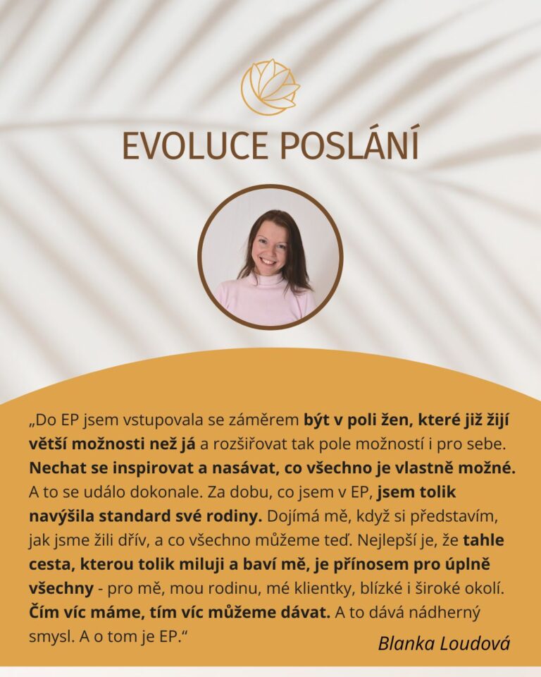 ,Jsem vizionářka a protože jsem chtěla víc, vstoupila jsem do EP. Moje mise je rozvíjet potenciál jednotlivce a organizací. Věřím, že podnikání je jedna z nejlepších cest ke svobodě. Proto učím ženy dát jejich tvoření strukturu, pracovat méně a vydělávat více. Evoluce Poslání je vyšším patrem, místem, kde jsou ženy dál a já se od nich můžu inspirovat. Můžu si přát, že jednou budu jako ony. A tak se také děje. Ženy, které pro mě byly idoly, jsou teď moje klientky a dobré kamarádky zároveň. A to je moje vyšší patro - místo, kde se podporujeme navzájem.”
